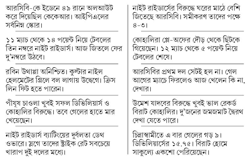 বারবার এমন ম্যাচ দেখা যাবে না আইপিএলে যে, বেঙ্গালুরুতে খেলতে গিয়েছে কলকাতা নাইট রাইডার্স। আর সেই ম্যাচ বিরাট কোহালিদের জন্য হয়ে দাঁড়িয়েছে নিয়মরক্ষার। কে জানত, অসাধারণ এক ক্রিকেট যাত্রা চলতে চলতেই এমন অন্ধকার আসতে পারে কোহালির ভরা ক্রিকেট সংসারে। একের পর এক হারছে তাঁর দল। একের পর এক ম্যাচে ব্যর্থ তাঁদের মহাতারকা ব্যাটিং!