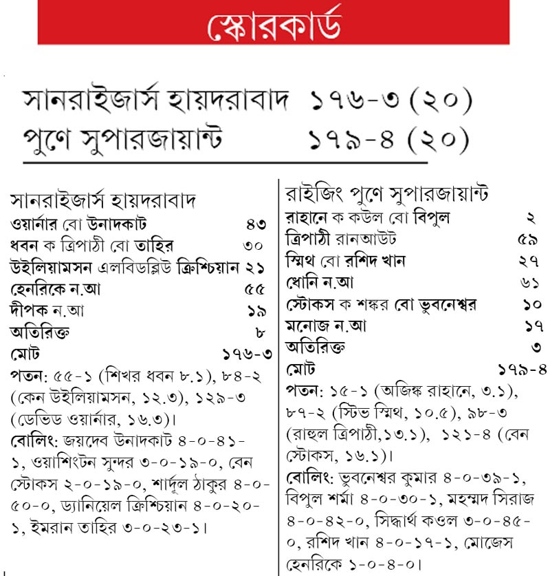 ধোনি শুধু ফিনিশারকে ফিরিয়ে আনলেন না, আইপিএলের দ্বৈরথও জমিয়ে দিলেন। টেবলের তলানিতে পড়ে থাকা পুণে উঠে এল চার নম্বরে। তাতে প্লে-অফের দৌড় চূড়ান্ত নাটকীয় আকার ধারণ করল। সানরাইজার্স হায়দরাবাদ ১৭৬ রান করেও হেরে ম্যাচ। তাদের বোলিং খুবই ভাল।