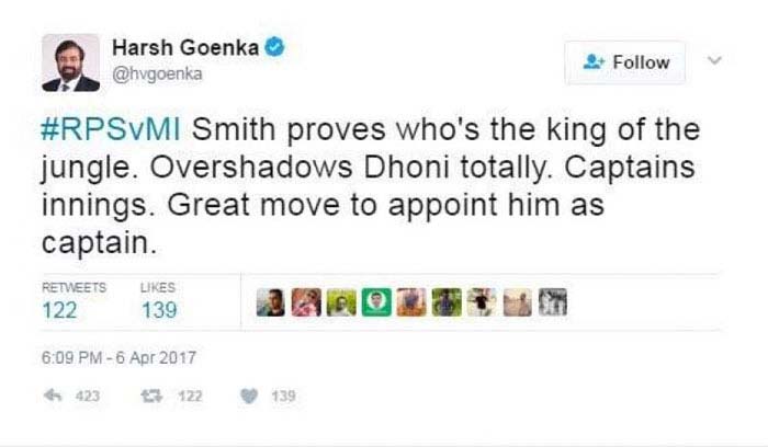 আইপিএলে দলের প্রথম ম্যাচেই জয়ের পর বিতর্কিত টুইট করে বসলেন রাইজিং পুণে সুপারজায়েন্টের কর্ণধার সঞ্জীব গোয়েনকার ভাই হর্ষ গোয়েনকা। শুক্রবার মুম্বই ইন্ডিয়ান্সের বিরুদ্ধে ৭ উইকেটে জেতে স্টিভ স্মিথের দল। তার পরই হর্ষ টুইটারে লেখেন, ‘স্মিথ প্রমাণ করে দিলেন তিনিই জঙ্গলের রাজা। ধোনি পুরোপুরি ফিকে হয়ে গেলেন। এই হচ্ছে অধিনায়কের ইনিংস। স্টিভকে অধিনায়ক করা দারুণ সিদ্ধান্ত।’