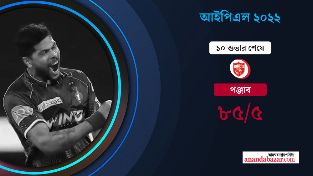 প্রথম দশ ওভারের মধ্যেই পাঁচ উইকেট হারাল পঞ্জাব। দুই উইকেট নেন উমেশ। একটি করে উইকেট পেয়েছেন টিম সাউদি, শিবম মাভি এবং সুনীল নারাইন। পঞ্জাবের হয়ে ক্রিজে রয়েছেন শাহরুখ খান এবং হরপ্রীত ব্রার।