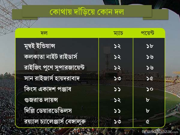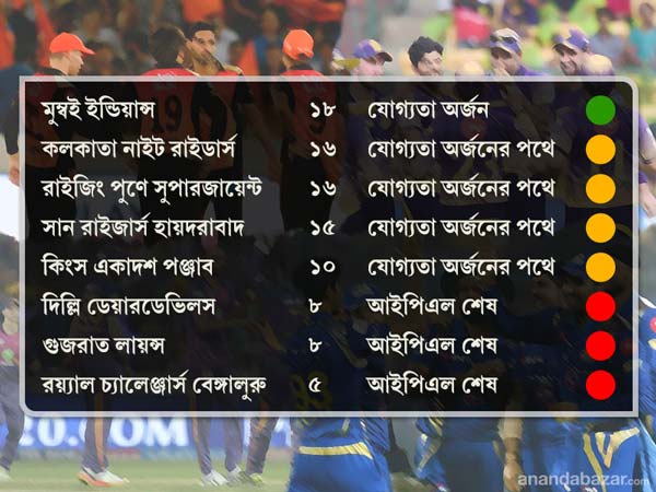 একই পয়েন্টে দাঁড়িয়ে কলকাতা নাইট রাইডার্স, ও রাইজিং পুণে সুপারজায়ান্ট। দুই দলেরই পয়েন্ট ১৬। ম্যাচ বাকি দুটো। মঙ্গলবার কিংস একাদশ পঞ্জাবের বিরুদ্ধে যদি কলকাতা জিতে যায় তা হলে আইপিএল-এর দ্বিতীয় দল হিসেবে প্লে-অফের ছাড়পত্র পেয়ে যাবে কলকাতাও। হাতে থাকবে শুধু মুম্বই ম্যাচ। দুই ম্যাচ হারলে তাকিয়ে থাকতে হবে অন্যান্যদের দিকেও। তা হলে পঞ্জাব অথবা পুণেকে তাদের একটি করে ম্যাচ হারতে হবে। পয়েন্ট এক হয়ে গেলেও রান রেটের বিচারে হয়তো শিকে ছিড়বে কলকাতার।