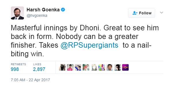 এই তো সেদিনের কথা, হর্ষ গোয়েন্কা টুইট করেন ‘স্মিথ প্রমাণ করে দিয়েছে জঙ্গলের রাজা কে? ধোনিকে পুরোপুরি ছাপিয়ে গিয়েছে। তাঁকে অধিনায়ক করাটা খুব ভাল সিদ্ধান্ত।’ তাঁর এই মন্তব্য মেনে নিতে পারেননি ধোনিপ্রেমীরা। সেই সময় এমনও দাবী ওঠে বয়কট করা হবে পুণের ম্যাচ। ধোনি অবশ্য প্রতিবারের মতো এ বারও সেই সব নিয়ে কোনও মন্তব্য করেননি। ধোনির হয়ে সে সময় ব্যাট ধরেছিলেন তাঁর স্ত্রী সাক্ষী ধোনি। সঙ্গে ছিল চেন্নাই সুপার কিংসের হেলমেট পরা তাঁর নিজের ছবি।