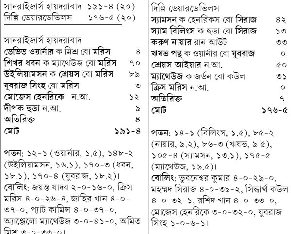 ডেভিড ওয়ার্নার রান না পেলেও উইলিয়ামসন এবং শিখর ধবন (৫০ বলে ৭০) মিলে সানরাইজার্স-কে ১৯১-৪ স্কোরে পৌঁছে দেন। জবাবে দিল্লির শ্রেয়স আইয়ার ৩১ বলে ৫০ করে একটা চেষ্টা করেছিলেন, কিন্তু লাভ হয়নি। দিল্লির ইনিংস থেমে যায় ১৭৬-৫ স্কোরে।