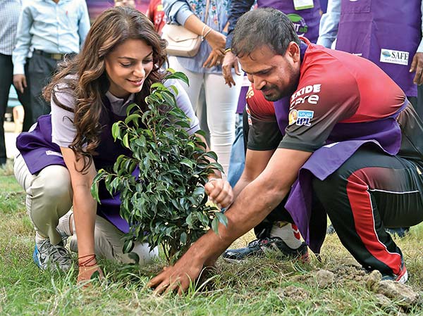 গাছ পুঁতলেন জুহি চাওলা। সঙ্গে কেকেআরের ক্রিকেটার ইউসুফ পাঠান। ছবি: সুদীপ্ত ভৌমিক