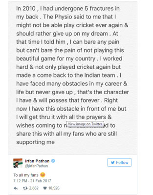 ২০১০এ পিঠে পাঁচটা ফ্র্যাকচারের পর ক্রিকেট ফেরার কোনও আশাই ছিল না। ফিজিও জানিয়ে দিয়েছিল আর খেলা হবে না। ক্রিকেট খেলার স্বপ্নটা এ বার ছাড়তেই হবে। কিন্তু সেদিন সেই স্বপ্ন ছাড়েননি ইরফান পাঠান। তাই ফিরেছেন ক্রিকেটে। সাফল্যের সঙ্গেই ফিরেছেন। কিন্তু এ বারের আইপিএল-এ দল না পেয়ে হতাশ ইরফান নিজের সেই সময়ের কথাই ভাগাভাগি করে নিয়েছেন সোশ্যাল মিডিয়ায়। দুটো বেস প্রাইজ নিয়ে দল পাননি ইশান্ত শর্মা। ৫০ লাখ বেস প্রাইজ নিয়ে দল পাননি ইরফান। এটা সত্যিই চমক ছিল। ৩২ বছরের পাঠান সদ্য মুস্তাক আলি টি২০ টুর্নামেন্টে পশ্চিমাঞ্চলের হয়ে ভালই খেলেছেন। তাঁর বলে, আউট হয়ে প্যাভেলিয়নে ফিরতে হয়েছে শিখর ধবন, যুবরাজ সিংহ ও ঋশভ পন্থকে। ফিটনেসের পিছনেও খেটেছেন তিনি। কিন্তু আইপিএল না খেলতা পারার হতাশাটা বেরিয়ে এসেছে ভীষন ভাবে। বলেন, ‘‘আমি মরসুম শুরুর আগে থেকে পুরো মরসুমে প্রচুর খেটেছি। ফিল্ডিংয়েও অনেক উন্নতি করেছি।’’ নবম আইপিএল-এ পাঠান খেলেছিলেন পুণের হয়ে। কিন্তু প্রথম একাদশে তেমনভাবে খেলার সুযোগ পাননি। ভেবেছিলেন এ বারও আইপিএল খেলার সুযোগ পাবেন। এই অল-রাইন্ডার দেশের হয়ে ২৯টি টেস্ট, ১২০টি ওডিআই ও টি২০ খেলেছেন। শেষ দেশের হয়ে খেলেছেন অক্টোবর ২০১২তে।
