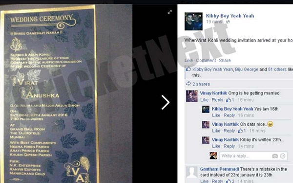 আসছে বছরের প্রথমেই কি বিয়েটা সেরে ফেলছেন বিরাট-অনুষ্কা? ফেসবুকের একটা হঠাত্ পোস্টে এই তারকা জুটির বিয়ে নিয়ে জল্পনাটা এক লাফে অনেক গুণ বেড়ে গেল। সোমবার ফেসবুকে জনৈক এক ইউজার এই সেলেব্রেটি কাপলের বিয়ের কার্ডের ছবি পোস্ট করেন। ছবি বলছে ২০১৬-এর ২৩ জানুয়ারি নাকি গাঁটছড়া বেঁধে ফেলছেন দু’জনে। অবশ্য পোস্ট করার এক মিনিটের মধ্যেই সরিয়ে ফেলা হয় এই ছবি।