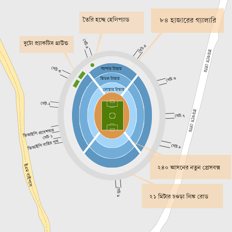বাঁ প্রান্তের দুটো ড্রেসিংরুমকে বিশ্বমানের বানিয়ে ফেলা হয়েছিল তিন বছর আগেই। সৌজন্যে আইএসএল। ওই দুইকে অটুট রেখেই বাকি কাজ করা হচ্ছে। নতুন করে তৈরি করা হচ্ছে মাঠে ঢোকার টানেল। এমনকী, গ্যালারিও। বসানো হয়েছে হাল্কা নীল রঙের বাকেট চেয়ার। প্রেসবক্সেরও জায়গা বদল হচ্ছে। পাল্টে গিয়েছে মাঠও। আর্টিফিশিয়াল টার্ফ তুলে লাগানো হয়েছে নতুন বারমুডা ঘাস। আনা হয়েছে সেই মার্কিন মুলুক থেকে। বিশ্বকাপ ঘাসের মাঠেই খেলা হবে। ১৯৮৪ থেকে ২০১১ পর্যন্ত ঘাসেরই মাঠ ছিল যুবভারতীতে। ২০১১তে এখানে টার্ফ বসানো হয়। ২০১৫-য় বিশ্বকাপের কথা মাথায় রেখেই সেই টার্ফ তুলে আবার ঘাসের মাঠ করা হয়। নতুন মাঠ অনেকটাই তৈরি। বাকি কাজ চলছে জোরকদমে। তৈরি হওয়ার পর থেকে এই প্রথম অ্যাথলেটিক্স ট্র্যাককেও ঢেলে সাজানো হচ্ছে নতুন করে। স্টেডিয়ামে কর্মরত এক জন বললেন, ‘‘সকাল ন’টা থেকে কাজ শুরু করি। শেষ হয় রাত ১০টায়। আবার পর দিন সকালে চলে আসি। দিন-রাত কাজ চলছে।’’