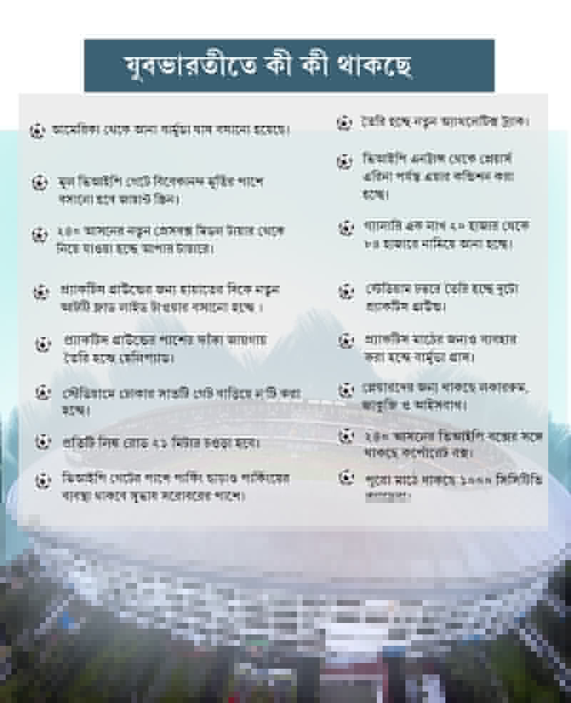 পছন্দ হলে বিশ্বকাপের ফাইনাল ভেন্যু হতে পারে এই যুবভারতী, তাও জানিয়ে দিয়েছে ফিফা। সেই লক্ষ্যেই জোরকদমে চলছে স্টেডিয়ামের কাজ। নতুন ইতিহাসের সাক্ষী হওয়ার অপেক্ষায় এই শহর। ভারতীয় ফুটবলের মক্কার এ বার শুধু স্বপ্ন দেখার পালা।