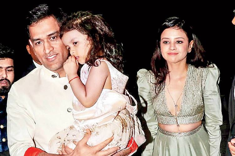 মুম্বইয়ে এক বিয়ের অনুষ্ঠানে স্ত্রী সাক্ষী ও মেয়ে জিভাকে নিয়ে ধোনি। ছবি: পিটিআই।