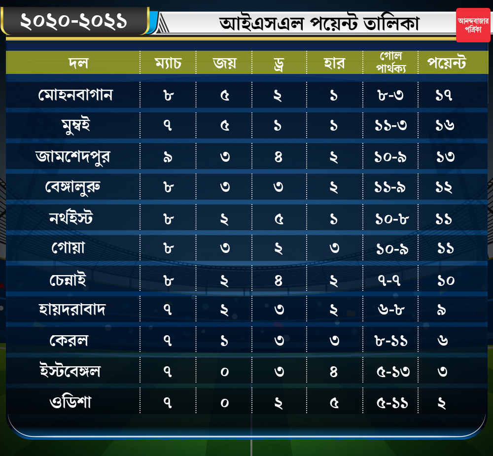 এটিকে-মোহনবাগান ও চেন্নাইয়িন ম্যাচ গোলশূন্য অবস্থায় শেষ হল। ম্যাচ ড্র হওয়ায় আইএসএলের পয়েন্ট তালিকায় শীর্ষে পৌঁছে গেল আন্তোনিয়ো লোপেজ হাবাসের দল। ৮ ম্যাচ থেকে রয় কৃষ্ণদের সংগ্রহ ১৭ পয়েন্ট।