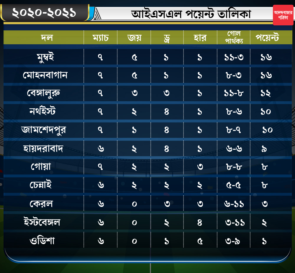 প্রথমার্ধের ৩৩ মিনিটে ডেভিড উইলিয়ামসের অনবদ্য গোল আনল ৩ পয়েন্ট। ম্যাচের সেরাও তিনি। এই জয়ের ফলে শীর্ষে থাকা মুম্বই সিটি এফসি-র ঘাড়ে নিঃশ্বাস ফেলছে এটিকে মোহনবাগান। দুই দলেরই পয়েন্ট সমান-সমান। ৬ ম্যাচে ১৬ পয়েন্টে দাঁড়িয়ে মুম্বই ও এটিকে মোহনবাগান। অন্য দিকে, বেঙ্গালুরু এফসি ৭ ম্যাচের পর দাঁড়িয়ে থাকল ১২ পয়েন্টেই।