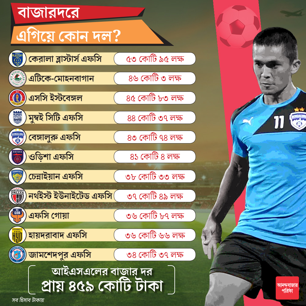 এ বারে ১১ দল নিয়ে খেলা হবে আইএসএল। সর্বসাকুল্যে তাদের বাজারদর ৪৫৯ কোটি টাকার বেশি। সব থেকে বেশি দর কেরালা ব্লাস্টার্সের। তাদের মোট বাজারদর ৫৩ কোটি ৯৫ লক্ষ টাকা। এর পরেই রয়েছে কলকাতার দুই দল। বাজারদরেও একে অপরকে টেক্কা দিচ্ছে দুই চিরপ্রতিদ্বন্দ্বী। সবুজ-মেরুনের বাজারদর ৪৬ কোটি ৩ লক্ষ। খুব পিছিয়ে নেই লাল-হলুদ। তাদের দর ৪৫ কোটি ৮৩ লক্ষ টাকা। তার পরেই রয়েছে মুম্বই সিটি এফসি। তাদের দর ৪৪ কোটি ৩৭ লক্ষ টাকা। বেঙ্গালুরু এফসির দর ৪৩ কোটি ৭৪ লক্ষ। সব চেয়ে কম দর জামশেদপুর এফসির (৩৪ কোটি ৩৭ লক্ষ টাকা)।
