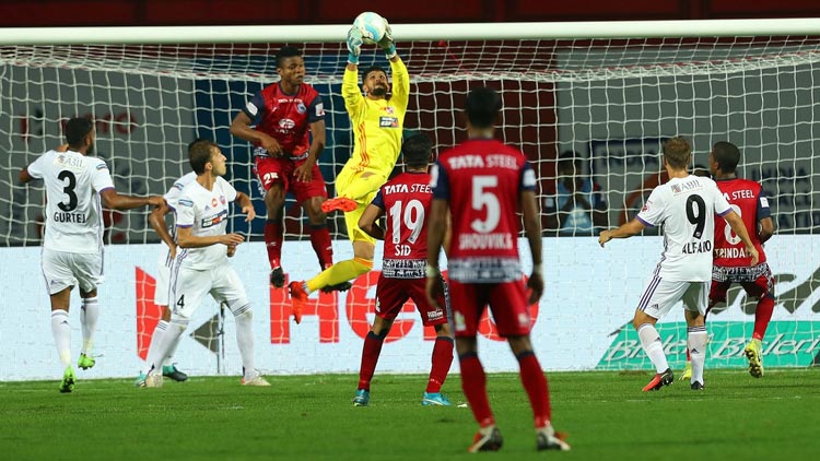 জামশেদপুরের আক্রমণ বাচাচ্ছেন পুণে গোলকিপার বিশাল কাইথ।