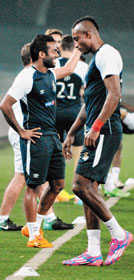 উজ্জ্বল লোবো। ম্লান ফিকরু। শনিবার আটলেটিকো দে কলকাতার প্র্যাকটিসে।
