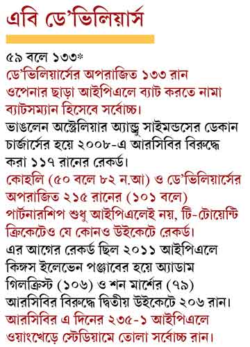 ও দিকে মুম্বই ইন্ডিয়ান্স আজ হেরে যাওয়ায় রোহিত শর্মাদের প্লে-অফে ওঠার স্বপ্ন কিছুটা হলেও ধাক্কা খেল। যারা বিরাট কোহলির ক্যাচ ফেলে দেয়, তারা আর কী ভাবে জিতবে? শেষ পর্যন্ত হারের ব্যবধান খুব বেশি না হলেও বিরাটের ক্যাচ ফস্কানোটা ম্যাচের গুরুত্বপূর্ণ মুহূর্ত। তখন বিরাট আউট হয়ে গেলে হয়তো এবি অতটা স্বচ্ছন্দ ভাবে খেলতে পারত না।