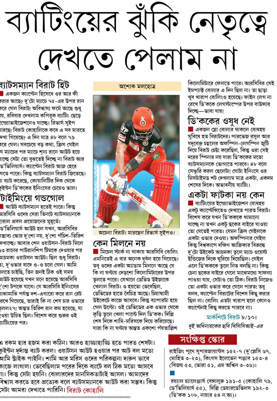 রয়্যাল চ্যালেঞ্জার্স বেঙ্গালুরু ১৯১-৫ (কোহালি ৭৯, ডে’ভিলিয়ার্স ৫৫), দিল্লি ডেয়ারডেভিলস ১৯২-৩ (ডি’কক ১০৮, নায়ার ৫৪ ন.আ)।