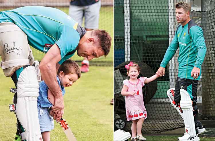 চনমনে: ইংল্যান্ডের বিরুদ্ধে চতুর্থ টেস্ট খেলতে নামার আগে মেলবোর্নের নেটে ছেলের সঙ্গে ক্রিকেট খেলছেন শন মার্শ (বাঁ দিকে)। মেয়েকে নিয়ে নেটে ডেভিড ওয়ার্নারও। ছবি: গেটি ইমেজেস