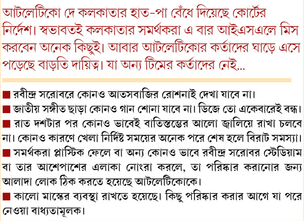 অভিষেক বচ্চন আর সৌরভ গঙ্গোপাধ্যায়—দুই টিমের দুই মালিক ছাড়া কোনও তারকা আজ মাঠে থাকছেন না মাতেরাজ্জি বনাম মলিনার যুদ্ধ দেখতে। যুবভারতীর তুলনায় মাত্র দশ শতাংশ দর্শক ঢুকতে পারবেন স্টেডিয়ামে। হাজার দশেক। পরিবেশ আদালতের নির্দেশে রয়েছে নানা আাচরণবিধি। যাতে গত বারের তুলনায় খেলার বাইরের জৌলুস কমবে অনেকটাই। সেটা এই টুনার্মেন্টের ইউএসপি।