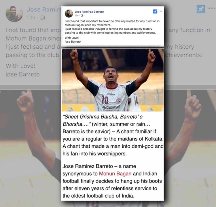 দু’ দফায় মোহনবাগানে খেলেন ব্যারেটো। ১৯৯৯ সালে প্রথম গঙ্গাপারের ক্লাবে যোগ দেন তিনি। ২০০৪ সালে ক্লাব ছেড়ে চলে গেলেও ফিরে আসেন ২০০৬ সালে। বহু দল তাঁকে পাওয়ার জন্য ঝাঁপালেও, মোহনবাগান ছেড়ে যাননি তিনি। সবুজ-মেরুন জার্সি পরে ৩৭১টি ম্যাচে তিনি করেছেন ২২৮ টি গোল। একক দক্ষতায় মোহনবাগানকে জিতিয়েছেন বহু কঠিন ম্যাচ। কলকাতা লিগ, জাতীয় লিগ, ফেডারেশন কাপের মতো বহু ট্রফি মোহনবাগান ঘরে তুলেছে তাঁর সময়ে। মোহনবাগান সমর্থকরা তাঁকে ‘কলকাতার যিশু’ শিরোপা দিয়েছিলেন। দলের প্রতি দায়বদ্ধতা তিনি প্রমাণ করেছেন বার বার। ইস্টবেঙ্গলকে ৫-৩ হারানো ম্যাচের শেষে খোঁড়াতে খোঁড়াতে ড্রেসিং রুমে ঢুকেছিলেন ব্যারেটো। তাঁর সতীর্থ মার্কোস পেরেরার চোখের নীচ থেকে রক্ত ঝরছে। সেই সময়ের ক্লাব-সচিব অঞ্জন মিত্র বাগানের সাজ ঘরে ঢুকেই ব্যারেটোর গাল টিপে দিয়েছিলেন। সমর্থকদের ভালবাসার দাম কী ভাবে দিতে হয়, তা তিনি বুঝিয়ে দিয়েছেন। শেষ ম্যাচের আগে ব্যারেটো বলে গিয়েছিলেন, ‘‘চিরকাল হৃদয়ে থাকবে মোহনবাগান।’’ শেষ ম্যাচেও গোল করেছিলেন তিনি। কিন্তু, আজ তাঁর এই পোস্ট বুঝিয়ে দিয়েছে সেই দায়বদ্ধতার কথা মনে রাখেনি ক্লাব।