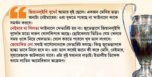 শনিবার বার্লিনে ইউরোপ সেরা হওয়ার লড়াইয়ে মাঠে নামছে ইতালীয় ফুটবলের ‘ওল্ড লেডি’ জুভেন্তাস। যে লড়াই বুফোঁর মতে ন’বছর আগের যন্ত্রণা ভোলানোর লড়াই। ‘‘ক্লাবের সঙ্গে অনেক কঠিন মুহূর্তের মধ্যে দিয়ে গিয়েছি। আবার পুরনো দাপট ফিরিয়ে দিতে চাই। সেরি এ টানা জেতায় কিছুটা হলেও যন্ত্রণার রেশ কেটেছে,’’ বলছেন বুফোঁ। আন্দ্রে পির্লো আবার মনে করছেন কালসিওপোলি বিতর্কের জেরে ইতালীয় ফুটবল ছেড়ে চলে গেলে হয়তো এই মুহূর্ত উপভোগ করতে পারতেন না। ‘‘আমি তখন এসি মিলানে ছিলাম। ওরাও বিতর্কে জড়িয়ে গিয়েছিল। অনেক ক্লাবের প্রস্তাব পেয়েও মিলান ছাড়িনি। আজ জুভেন্তাসে খেলতে পেরে ভাগ্যবান মনে হচ্ছে।’’