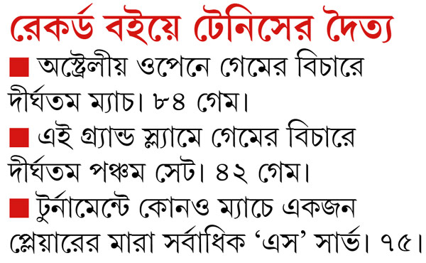 পরের মাসেই আটত্রিশে পা দিতে চলা বিশ্বের ২১ নম্বর প্লেয়ার দু’সেট পিছিয়ে পড়েও পাঁচ ঘণ্টা চোদ্দো মিনিট লড়াইয়ের পর বিশ্ব র্যাঙ্কিংয়ে ৬৮ নম্বর আর্জেন্তিনীয় হোরাসিও হেবালসকে ৬-৭ (৬-৮), ৩-৬, ৭-৫, ৬-২, ২২-২০ হারানোর পথে তিন-তিনটে রেকর্ড করে ফেললেন। অস্ট্রেলীয় ওপেনের ইতিহাসে দীর্ঘতম পঞ্চম সেট খেলার (৪২ গেম)। এই টুর্নামেন্টে একটা ম্যাচে কোনও প্লেয়ারের সর্বাধিক ‘এস’ সার্ভ করার (৭৫টা)। গেমের বিচারে অস্ট্রেলীয় ওপেনের দীর্ঘতম ম্যাচের (৮৪ গেম)।