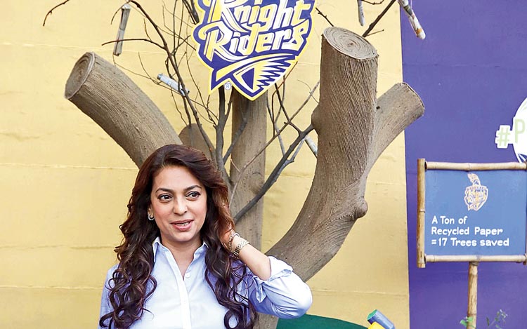 উদ্যোগ: পরিবেশ রক্ষার বিশেষ বার্তা নিয়ে রবিবার ইডেনের সামনে হাজির জুহি চাওলা। নিজস্ব চিত্র