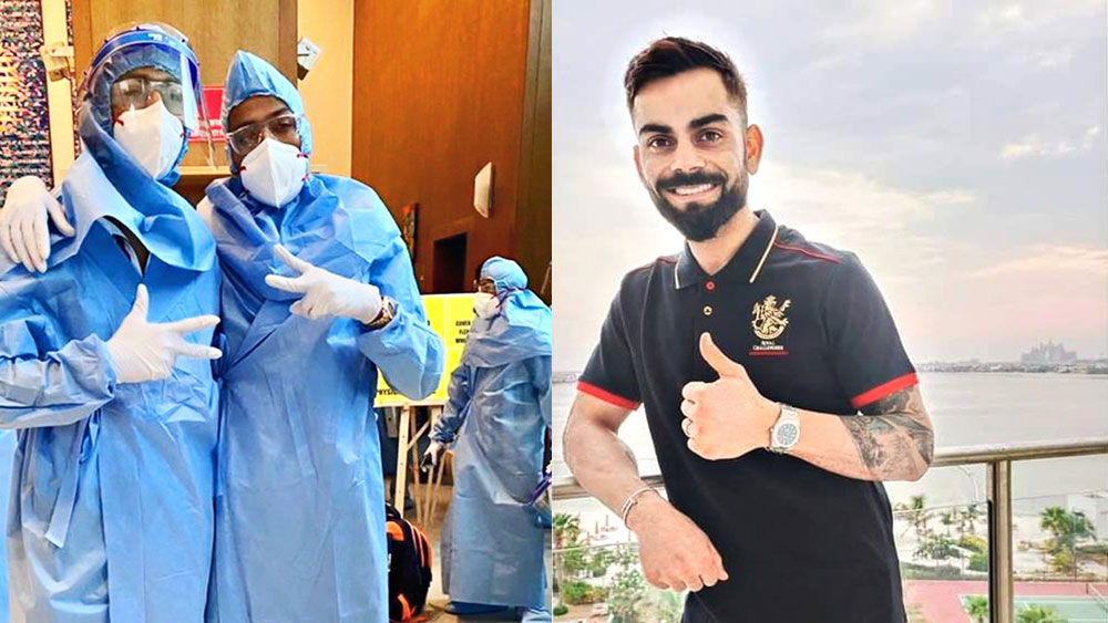 নবরূপে: ‘পিপিই কিট’ পরে যাত্রা দুই ভাই, ক্রুণাল ও হার্দিকের। আগমন: তিনি ফিরছেন ক্রিকেটে। দুবাই পৌঁছে বিরাট কোহালি। ছবি: টুইটার ও ফেসবুক।