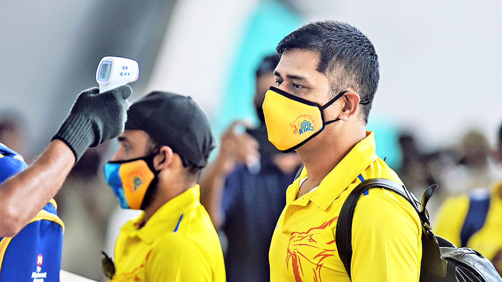 পরীক্ষা: দুবাইমুখী। বিমানবন্দরে তাপমাত্রা মাপা হচ্ছে ধোনির। ছবি: পিটিআই।