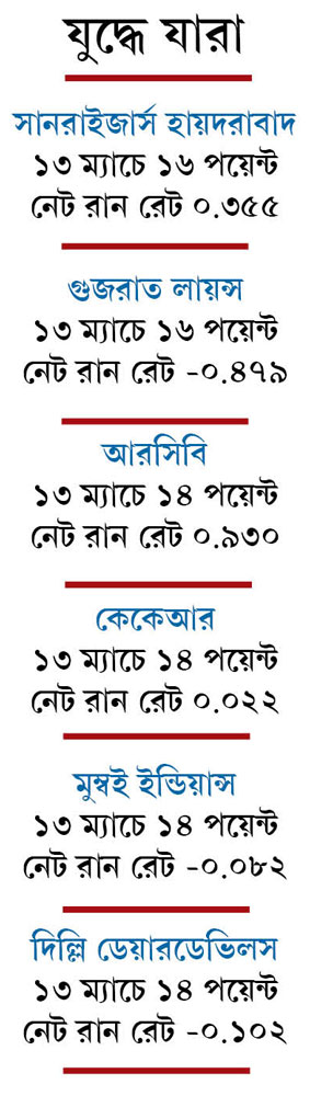 নিজেদের হাতে আর কিছু থাকবে না। অন্য দলের উপর নির্ভর করে থাকতে হবে। মুম্বই ইন্ডিয়ান্সের সঙ্গে গুজরাত লায়ন্সের খেলা শনিবার। যদি মুম্বই হারে, তা হলে শেষ ম্যাচ বৃষ্টিতে পণ্ড হলেও প্লে-অফে চলে যাবে নাইটরা। কিন্তু মুম্বই জিতলে আর ইডেন ম্যাচ না হলে কেকেআরের আশা কার্যত শেষ। গম্ভীরদের সুবিধে, তাঁরা মুম্বই কী করল-না করল আগেভাগে জেনে যাচ্ছেন।