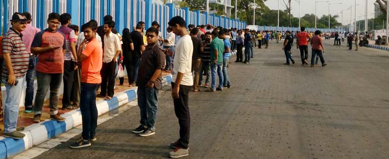 স্টেডিয়ামের বাইরের দীর্ঘ লাইনের শেষটা খুঁজে পাওয়া বেশ দুষ্কর। পরে আসা সমর্থকরা কোথায় দাঁড়াবে বুঝেই উঠতে পারছেন না। কিন্তু দারুণভাবে তৎপর পুলিশ। প্রতিমুহূর্তে সাহায্যের হাত বাড়িয়ে দিচ্ছে। কাতারে কাতারে মানুষের মধ্যেও কোনও উত্তেজনা নেই। বিক্রি হচ্ছে ব্রাজিলের রিস্ট ব্যান্ড, পতাকা, ফেট্টি। তার চাহিদাও তুঙ্গে। লাইনে দাঁড়িয়েই সবাই সবার মাথায় ফেট্টি বেঁধে দিচ্ছে। যেন ফুটবল উৎসবে মেতেছে কলকাতা।