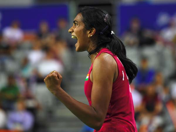 ম্যাচের মাঝে সিন্ধু। ছবি: এএফপি।