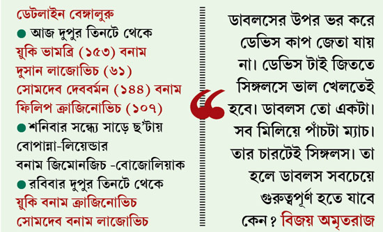 আনন্দের বিখ্যাত টেনিস-দাদা এখন বেঙ্গালুরুতেই। এবং বিজয় অমৃতরাজ আজ ‘ওয়াইন সংগ্রহ অভিযান’-এর প্রচার অনুষ্ঠানে এই টাইয়ের যে ভবিষ্যদ্বাণী করেছেন, সেটা জানলে আনন্দ মোটেই খুশি হবেন না। “আমার পছন্দের স্ক্রিপ্ট হতো, প্রথম সিঙ্গলসে সোমদেব সার্বিয়ার দ্বিতীয় সিঙ্গলস প্লেয়ারকে হারিয়ে ভারতকে ১-০ এগিয়ে রাখবে আর পরের সিঙ্গলসে য়ুকি খোলা মনে খেলে এই সার্বিয়া দলের সেরা তারকাকে চাপে রাখবে। কিন্তু আসল ড্রয়ের পর এখন টাই-টা ৫০-৫০।”