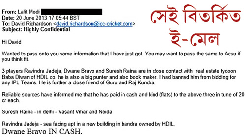 ফাঁস হওয়া সেই ই-মেল করা হয়েছিল আইসিসি সিইও ডেভ রিচার্ডসনকে। দু’বছর আগে। প্রেরকের জায়গায় রয়েছে ললিত মোদীর নাম। যেখানে তিন আন্তর্জাতিক ক্রিকেটারকে ২০১৩-র আইপিএল কেলেঙ্কারিতে জড়িয়ে ফেলা হয়। এঁদের মধ্যে দু’জন ভারতীয়— সুরেশ রায়না ও রবীন্দ্র জাডেজা। তৃতীয় জন ওয়েস্ট ইন্ডিজের ডোয়েন ব্র্যাভো।