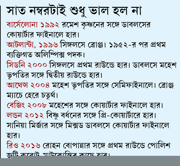 কুবোট আর মাটকোস্কির পোলিশ জুটির কাছে লিয়েন্ডার আর রোহন বোপান্না ৪-৬, ৬-৭ (৬-৮) হারটা অবশ্য অনেকের কাছে শকিং লাগতে পারে। কিন্তু একটা ব্যাপার মাথায় রাখতে হবে অলিম্পিক্সে এ রকম টপ পোলিশ টিমের বিরুদ্ধে খেলার মতো যথেষ্ট প্রস্তুতি লিয়েন্ডারদের ছিল না। ৪৮ ঘণ্টাও তো হয়নি লিয়েন্ডার রিওতে পা রেখেছে। বোপান্নার সঙ্গে প্র্যাকটিস করার, পরিবেশের সঙ্গে মানিয়ে নেওয়ার সময়টা পেল কোথায়! অলিম্পিক্সের চ্যালেঞ্জ নেওয়ার আগে একটা টুর্নামেন্টও লিয়েন্ডার-বোপান্নাকে জুটিতে খেলতে দেখা যায়নি। সেটাও কিন্তু একটা ফ্যাক্টর।