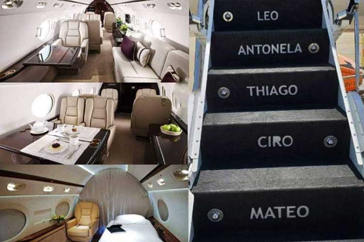 এল এম টেন-এবং ওঁর পরিবারের অন্য সদস্যদের নামও যে খোদাই করা বিমানের সিঁড়িতে! একদম উপরে মেসি, তার পরের ধাপে স্ত্রী আন্তোনেলা এবং তারপর দুই ছেলে থিয়াগো ও সিরো। নাহ, মেসি এই উড়োজাহাজটা নিজে কেনেননি। একটা কোম্পানি তাঁকে লিজ দিয়েছে। আসলে এলএম টেন-এর মতো দুনিয়াকাঁপানো সেলিব্রিটিদের দেশ ঘোরার জন্য এই ধরনের এয়ারবাসগুলোকে ভাড়া দিয়ে সংস্থাটি নিজেদের আয় বাড়াতে আগ্রহী।