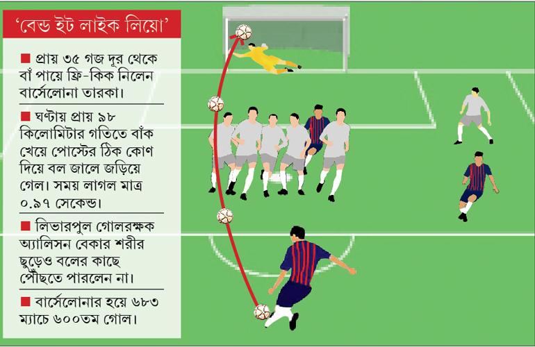 সুয়ারেসের প্রথম গোলের পরে দ্বিতীয় গোলটাও তিনি করতে পারতেন। বারে লেগে ফিরে আসার পরে মাথা ঠান্ডা রেখে গোলে ঠেলে দিলেন মেসি। বার্সেলোনা ২, লিভারপুল ০। এই গোলটার পরেই পাল্টে গেল ম্যাচের রং। এর পরেই পঁয়ত্রিশ গজ দূর থেকে ফ্রি-কিকে মেসির ঐশ্বরিক গোল। লিভারপুলের গোলকিপার ব্রাজিলীয় অ্যালিসন বেকার উড়ে গিয়েও বাঁচাতে পারলেন না। বাঁ পায়ে মেসির বাঁক খাওয়ানো শট ঢুকল বেকারের ডানদিকের উপরের কোণ দিয়ে। এত নিখুঁত সেই ফ্রি-কিক যে, মনে হবে, গোলকিপার ডানায় ভর করে উড়ে গেলেও শুধু ওই জায়গাটাতেই পৌঁছতে পারতেন না। ঠিক সেই ছিদ্র দিয়েই বাসরঘরে ঢুকে পড়ল সাপ। দুর্ধর্ষ গোলের মতোই দুরন্ত উৎসবে মাতল বার্সা।