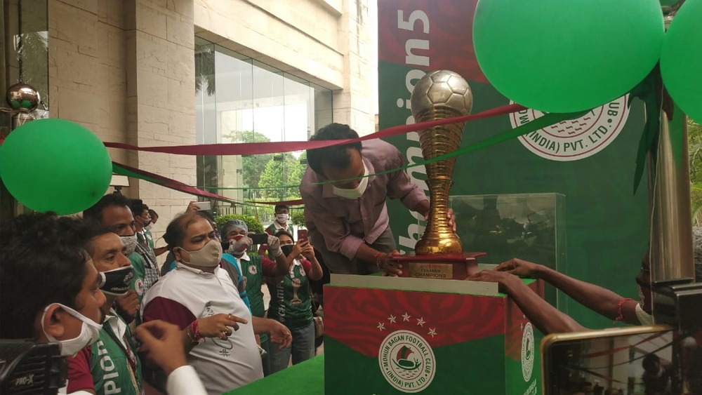 ৮ মাস আগে লিগ জিতেছিল দল। অতিমারির কারণে ট্রফি পেতে বিলম্ব হল এতদিন। অবশেষে, রবিবার সকালে আনুষ্ঠানিক ভাবে ক্লাবকে ট্রফি দিল ফেডারেশন। বাইপাস সংলগ্ন পাঁচতারা হোটেলে ক্রীড়ামন্ত্রী অরূপ বিশ্বাস ও আই লিগের সিইও সুনন্দ ধরের উপস্থিতিতে আই লিগ ট্রফি তুলে দেওয়া হল মোহনবাগান সভাপতি স্বপনসাধন বসুর হাতে। উঠল ‘মোহনবাগান জিন্দাবাদ’ ধ্বনি। বাইরে তখন চলছে গান। সূর্যের রং সবুজ-মেরুন।