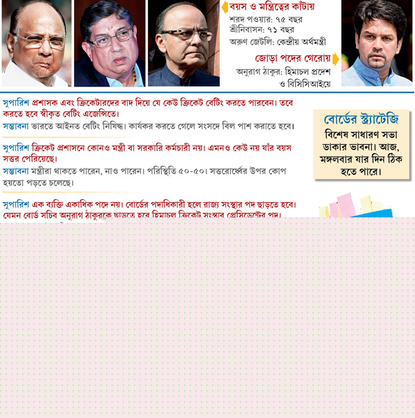 মনে করা হচ্ছে এটা গৃহীত হয়ে যাবে। এত দিন চাপের মুখে বোর্ড প্রেসিডেন্ট তিনটি ভোট দেওয়ার সুযোগ পেয়েছেন। যা গণতান্ত্রিক কাঠামোয় ভাবা যায় না। একটা ভোট তাঁর নিজের। একটা ভোট যে রাজ্য সংস্থার তিনি প্রতিনিধিত্ব করছেন, তার। একটা টাই হলে তাঁর কাস্টিং ভোট। মাত্র তিরিশ জন ভোটারের মধ্যে এক জনের ভোট তিনটে, এটা খতিয়ে দেখে আশ্চর্য হয়ে যান বিচারপতি লোঢা। তাঁর কড়া সুপারিশ, ওটা একে নামাও। সুপ্রিম কোর্ট সিলমোহর দিলে শশাঙ্ক মনোহরের রাতারাতি ব্যক্তিগত দু’ভোট কমবে।
