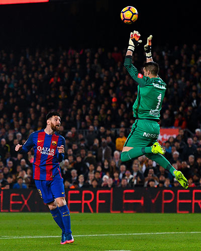 নায়ক: লা লিগায় স্পোর্টিং গিহনের বিরুদ্ধে হেডে লিওনেল মেসির অনবদ্য সেই গোলের মুহূর্ত। ছবি: এএফপি।