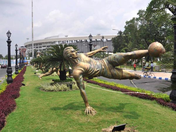 সল্টলেক স্টেডিয়ামে মূল গেটের সামনেই রয়েছে এই মূর্তি। —নিজস্ব চিত্র।