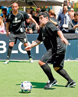 আবার মাঠে নেমে পড়লেন ফুটবলের রাজপুত্র। প্যারিসে এক প্রদর্শনী ম্যাচে মারাদোনা। ছবি: এএফপি।