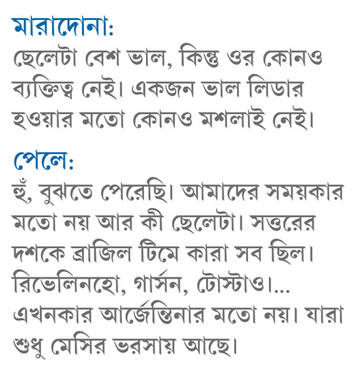 পেলে খোঁচা মেরেছেন। তিনি ব্রাজিলীয়, ব্রাজিল-আর্জেন্তিনার ফুটবল-সম্পর্ক কেউ বিচার করলে, ব্যাপারটা অনুচিত ঠেকলেও অস্বাভাবিক লাগবে না। কিন্তু তাই বলে মারাদোনা? ফুটবল-বিশ্বে তোলপাড় পড়ে গিয়েছে যে, আর্জেন্তিনার দুই শ্রেষ্ঠর মধ্যে কী এমন ঘটল যে, মারাদোনা পেলেকে এটা বলে দেবেন? যে পেলে নিয়ে এক সময় মুখ খুলে গরমাগরম শিরোনাম সৃষ্টিই কিংগ দিয়েগোর মনের মতো কাজ ছিল! এটাও বলাবলি চলছে যে, মেসি বিশ্বকাপ এখনও না জিততে পারেন। কিন্তু দেশকে টানেন না, পুরনো সেই বদনাম এখন আর তাঁকে দেওয়া যায় না। ব্রাজিল বিশ্বকাপে আর্জেন্তিনা যে কাপ ফাইনাল খেলেছিল, খেলেছিল লিও-র জন্যই। বিশেষ করে গ্রুপ পর্বে। আর্জেন্তিনা যখন গোল পেতে বারবার এলএম টেনের দিকে তাকিয়ে থেকেছে। তা হলে?