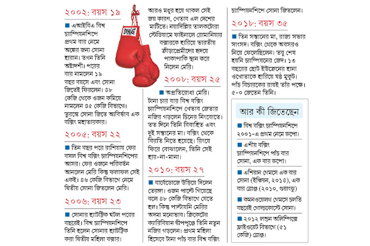 এর কয়েক দিন পরেই হঠাৎ মেরির ফোন। ‘‘স্যর, শিবিরে টেকনিক্যাল লোক কম। তুমি কোচ হয়ে আমাকে বিশ্বচ্যাম্পিয়ন হতে সাহায্য কর। সমালোচকদের জবাব দিতে চাই বিশ্বচ্যাম্পিয়ন হয়ে।’’ আজ যখন ষষ্ঠবার বিশ্ব চ্যাম্পিয়ন মেরি জাতীয় সঙ্গীত গাইছিলেন, তখন ওই সকালটা মনে পড়ছিল।