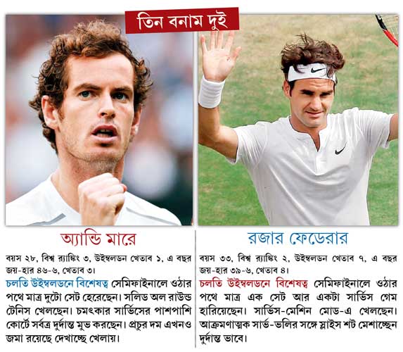 রজার বনাম অ্যান্ডি কতটা অনবদ্য ম্যাচ হবে সেটা সময়ই বলবে। তবে দুই মহারথীর শুক্রবারের ম্যাচ তাঁদের আগের ২৩টা লড়াইয়ের চেয়ে একটা ব্যাপারে যে অন্য রকম সেটা প্রথম পয়েন্টের আগেই বলে ফেলা যায়। আর সেই ‘অন্য রকম’টাই ২০১৫ উইম্বলডন-এর মহাসেমিফাইনালের ভাগ্য গড়ে দিতে পারে।