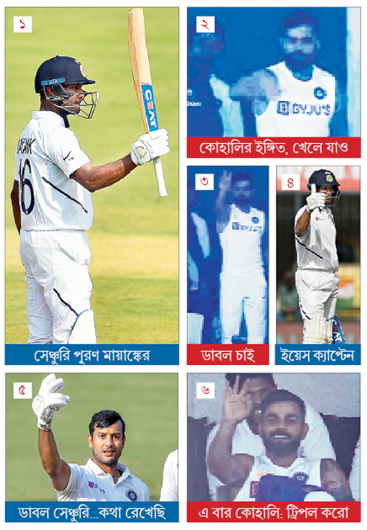 পরের মুহূর্তটা আরও অসাধারণ। মেহদি হাসান মিরাজকে ছয় মেরে ডাবল সেঞ্চুরি করে মায়াঙ্ক দু’আঙুল তুলে ড্রেসিংরুমের দিকে ইশারা করলেন, তিনি অধিনায়কের সেই আবদার মিটিয়েছেন। কিন্তু কোহালি যে অন্য ধাতুতে গড়া। হাসতে হাসতে এ বার তিনি তিন আঙুল তুলে ইশারা করলেন, রানটাকে এ বার তিনশোতে নিয়ে চলো।