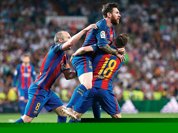 চ্যাম্পিয়নের দৌড়ে থাকতে গেলে জিততেই হবে এই পরিস্থিতিতে রিয়ালের ঘরের মাঠ সান্তিয়াগো বের্নাবাউতে গিয়ে ৩-২ জিতে ফিরল বার্সেলোনা। তাও আবার শুরুতে পিছিয়ে গিয়েও। কাসিমিরো যখন রিয়ালকে এগিয়ে দিচ্ছেন তখন ফাটা মুখ দিয়ে ঝরঝর করে রক্ত পড়ছিল মেসির। এর কিছু পরেই বার্সেলোনার সমতায় ফেরা মেসি ম্যাজিকেই। দ্বিতীয়ার্ধে ফের র্যাকিটিচ গোল করে এগিয়ে দিয়েছিলেন লুইস এনরিকের দলকে। কিন্তু রিয়ালকে ফের সমতায় ফেরান হামেস রদ্রিগেজ। কিন্তু ম্যাচের একদম অন্তিম সময়ে গোল করে বার্সার জয় আনলেন সেই মেসি।