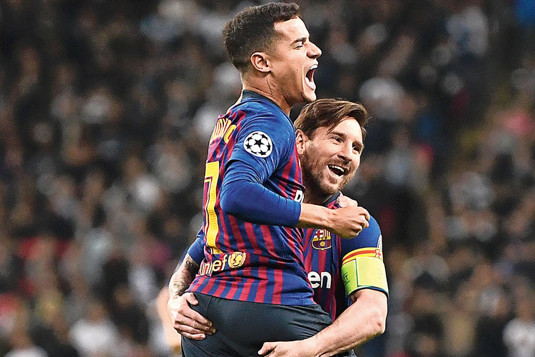 যুগলবন্দি: গোলের পরে মেসির গোলে কুটিনহো। গেটি ইমেজেস