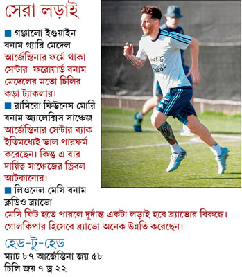 আর্জেন্তিনা শিবির যখন জেরবার মেসির চোটে তখন চিলি আত্মবিশ্বাসী। বার্সেলোনায় মেসির সতীর্থ ও চিলির গোলরক্ষক ক্লডিও ব্র্যাভো যেমন জানিয়ে দিলেন, তাঁদের দল মোটেও ভাবছে না মেসি মাঠে থাকবেন কি না। ‘‘মেসি থাকুক কি না থাকুক তাতে আমাদের প্ল্যান বদলাবে না। তবে আমার ব্যক্তিগত ভাবে মনে হয় মেসি খেলবে।’’ আবার বাকি দাবিদারদের চ্যালেঞ্জ ছুড়ে গত বারের চ্যাম্পিয়ন যোগ করেন, ‘‘আমরা তৈরি আবার চ্যাম্পিয়ন হতে। খুব আক্রমণাত্মক চিলিকে আপনারা দেখতে পাবেন এই টুর্নামেন্টে।’’