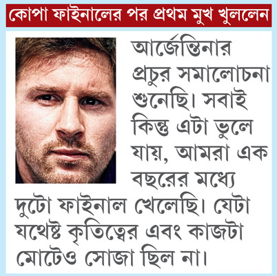 বিশ্বকাপের পর কোপা আমেরিকা ফাইনালেও হারের ধাক্কায় বেসামাল হয়ে গিয়েছিল মেসির আর্জেন্তিনা। খোদ আর্জেন্তিনীয় মহাতারকাও সমালোচনার তোড়ে এতটাই ক্ষতবিক্ষত হয়েছিলেন যে জনসমক্ষে তার পর আর কথা বলেননি। এ দিন মেসির যন্ত্রণাটা তাই স্পষ্ট ফুটে উঠছিল তাঁর কথায়, ‘‘আর্জেন্তিনার প্রচুর সমালোচনা শুনেছি। সবাই কিন্তু এটা ভুলে যায়, আমরা এক বছরের মধ্যে দুটো ফাইনাল খেলেছি। যেটা যথেষ্ট কৃতিত্বের এবং কাজটা মোটেও সোজা ছিল না।’’