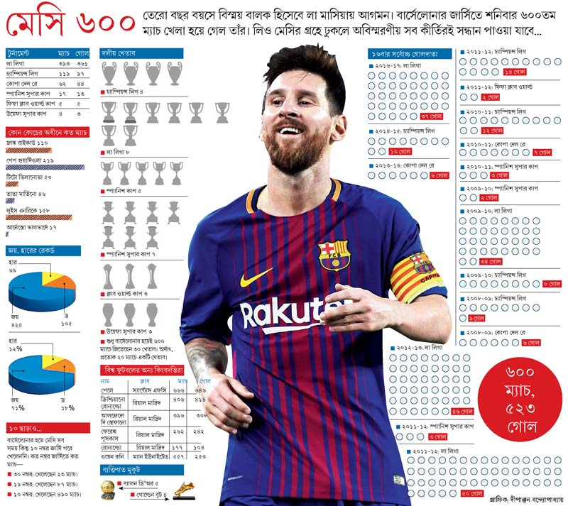 লিওনেল মেসি মানে অবিশ্বাস্য সব গোল। লিওনেল মেসি মানে চোখ ধাঁধানো সব ড্রিবল। লিওনেল মেসি মানে অভাবনীয় সব কীর্তি। যার একটার সাক্ষী থাকল শনিবার রাতের ক্যাম্প ন্যু। যখন বার্সেলোনার হয়ে তাঁর ছ’শোতম ম্যাচ খেলতে নামলেন মেসি।